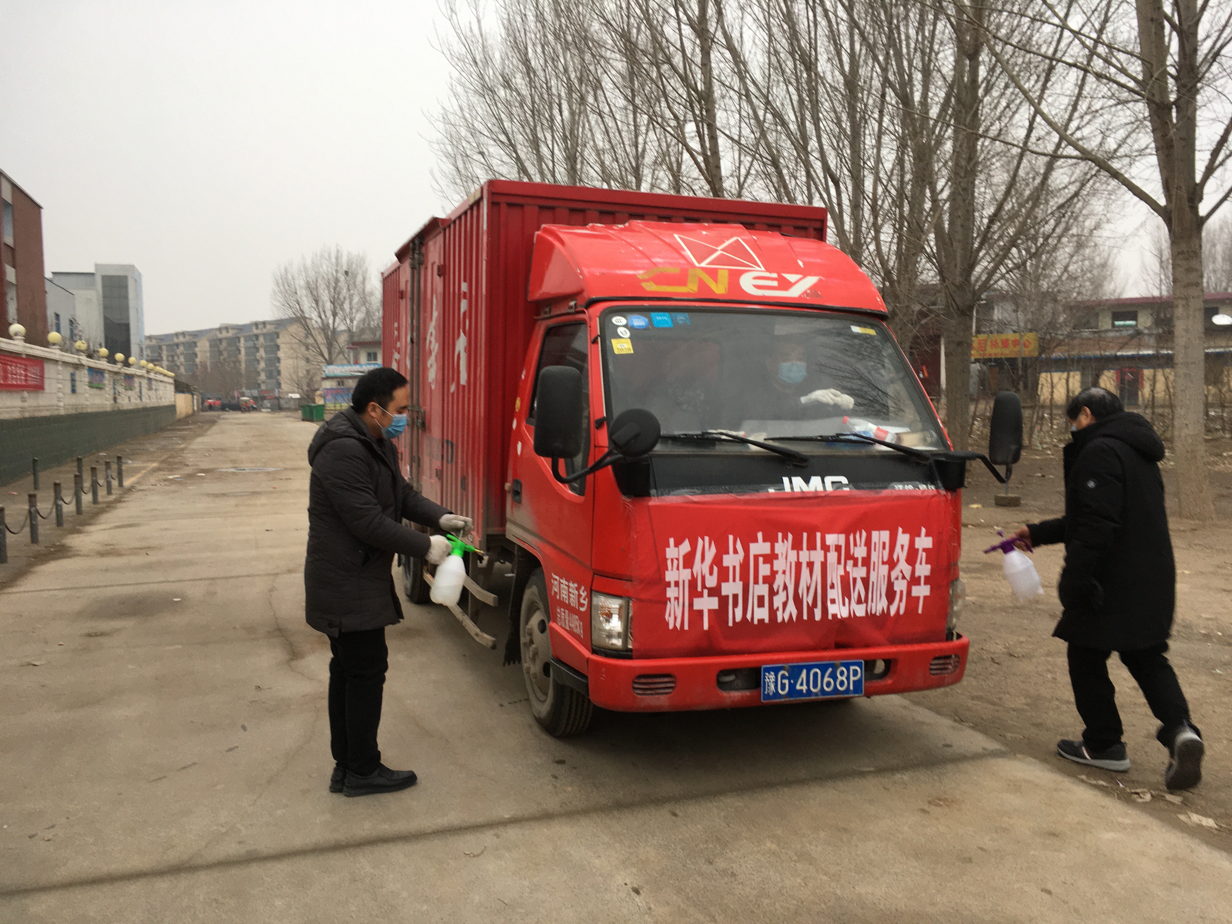 在教材发放工作中,新乡市店一是拉长教材发放时间段,尽可能减少不必要的人员聚集,将以往发放时间由5天调整至14天以上,控制每天发放学校的数量(10所左右)和参与取书的老师人数(每所学校除司机外,只能到2人);二是备足防控物资,加强进出人员及车辆管理,落实消毒等防控措施,做到每人必测体温、每车必消毒,设置进口与出口消毒点,配备酒精、流动水源等设施,由专人负责消毒,