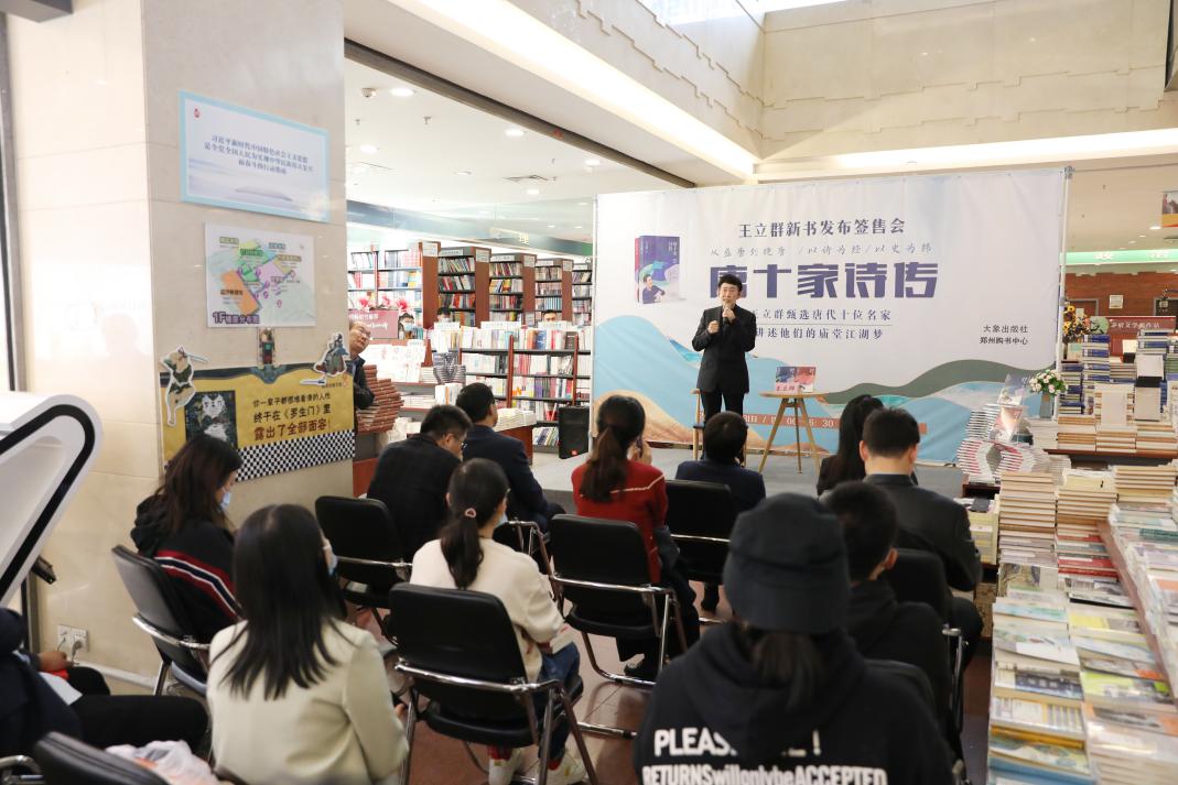 为了能与王立群先生面对面交流,上千名读者一早来到郑州购书中心排队等候,还有不少读者从外地专程赶来,有来自荥阳的诗词爱好者,也有来自重庆的“铁杆”书粉。王立群与读者们真诚地分享了该书选取的主要人物,从盛唐到晚唐,以诗为经,以史为纬,深刻的解读了一代诗人的庙堂江湖梦。在新书发布会上,王立群说,以往的唐代诗歌作品解读类书籍,一般是通过介绍单篇作品进行人物或作品解读,就像一颗颗珍珠没有串成线。在新书《唐十家诗传》中,他在唐代众多诗人中选了十位诗人,将这些诗人的人生,用文学散文笔法介绍其人生重要节点的代表作,并一一解读,好比把一颗颗珍珠似的作品以诗人生平为线串连起来,侧重讲述创作的时间、地点、创作的缘由。活动现场,王立群还与读者朋友进行了亲切的互动,对读者提出的问题,他以一个长辈的身份,从专业的角度进行了解答,现场掌声不断。