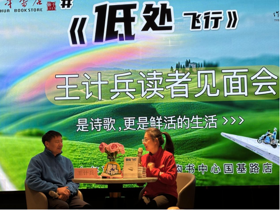 活动现场,王计兵还展示了自己的诗集《低处飞行》,并深情朗诵了书中代表作。他的诗歌语言质朴而深情,让在场的每一个人都感受到了诗歌的力量和美好。此外,他还与读者们进行了互动交流,回答了他们关于诗歌创作、人生哲学等方面的问题。其中谈到关于子女教育的问题时,王老师表示:“只要孩子付出了自己最大的努力,做到不后悔就是最好的结果。”