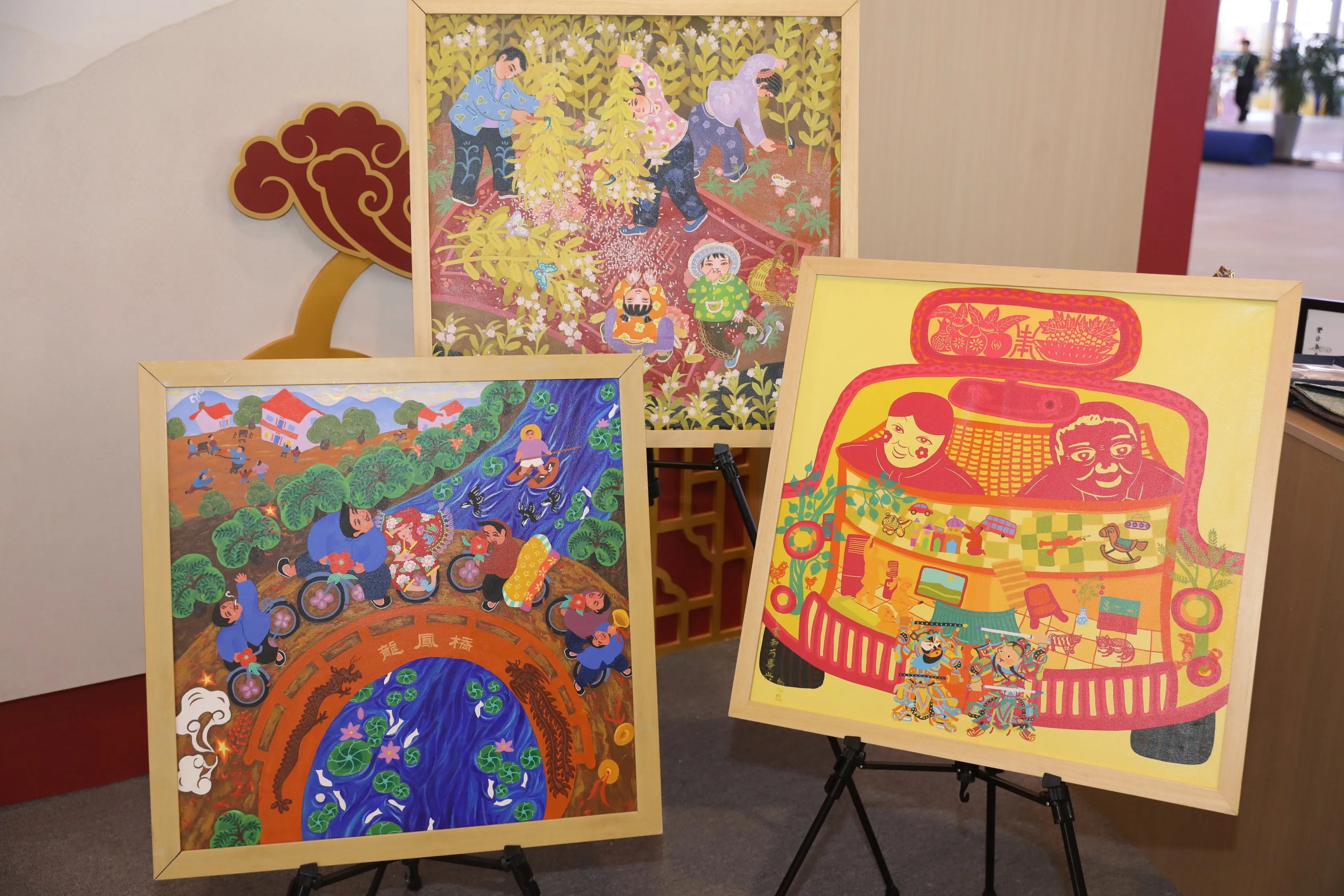 在展馆的另一角,舞阳农民画以其独特的艺术魅力吸引着众多观众。河南电子音像出版社副总编李亚楠介绍,围绕这一省级非遗项目,他们打造了“一本画册、一套课程和一个微纪录片”的项目矩阵。