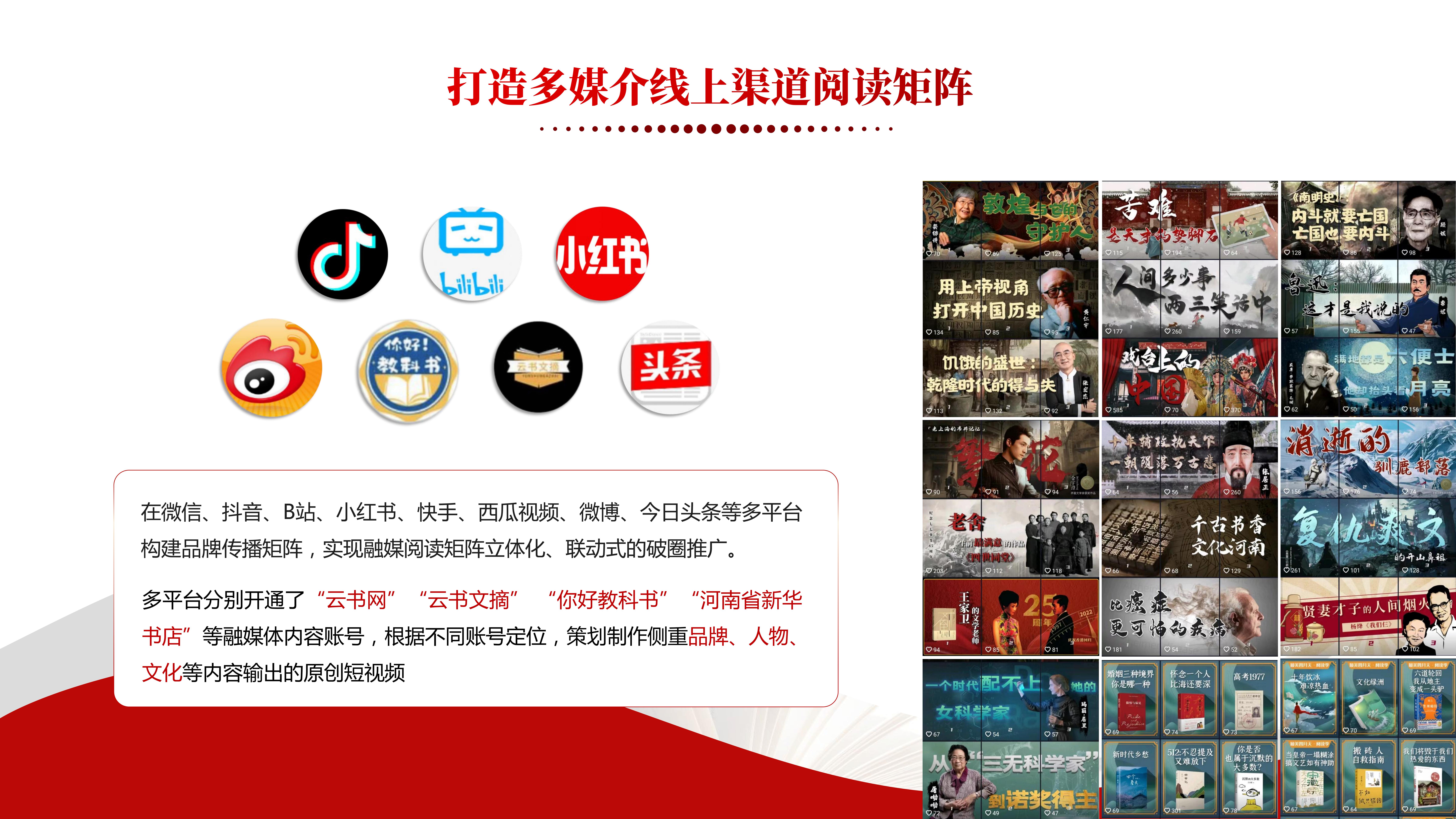 河南省新华书店紧贴人民群众线上需求,主动顺应数字经济发展方向与新时期阅读潮流,坚持以互联网思维构建融媒阅读传播矩阵,布局搭建了云书网、百姓文化云、书香河南公共文化平台,以及各类阅读社群、直播矩阵、短视频等融媒矩阵平台,形成了“在线、在手、在场、在云”阅读体系,持续完善构建线上线下融合互动、立体覆盖的文化服务供给体系,倾力为人民群众提供多端触达、全域全景的线上阅读服务。