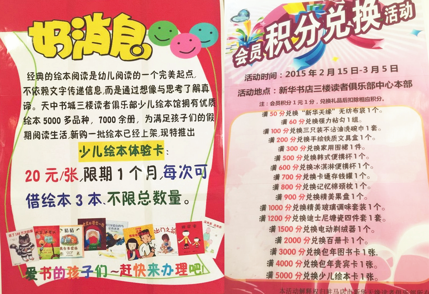 2015年春节来临之际,驻马店市店读者俱乐部对中心本部借阅区,进行扩大调整,并对少儿绘本馆进行独立升级。通过制作张贴新书好书推荐海报,春节主题装饰,加大宣传力度,精心策划一系列宣传促销活动,回馈读者。同时加紧更新借阅区的图书、杂志、绘本的种类和内容,还针对会员开展了一系列礼品兑换活动。焕然一新的借阅场地、喜庆的节日氛围和这些营销活动的开展,使得俱乐部的人气和销售得到大幅增加。